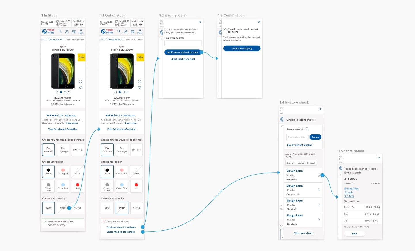 Flows showing the option to be notified when back in stock and viewing stock at your local store.