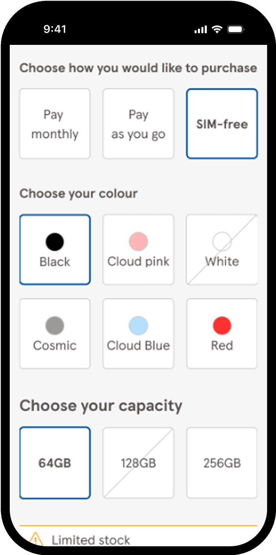 For example, components could be removed for the SIM-free product pages as there was no need to display contract information or data usage options for this purchase plan.