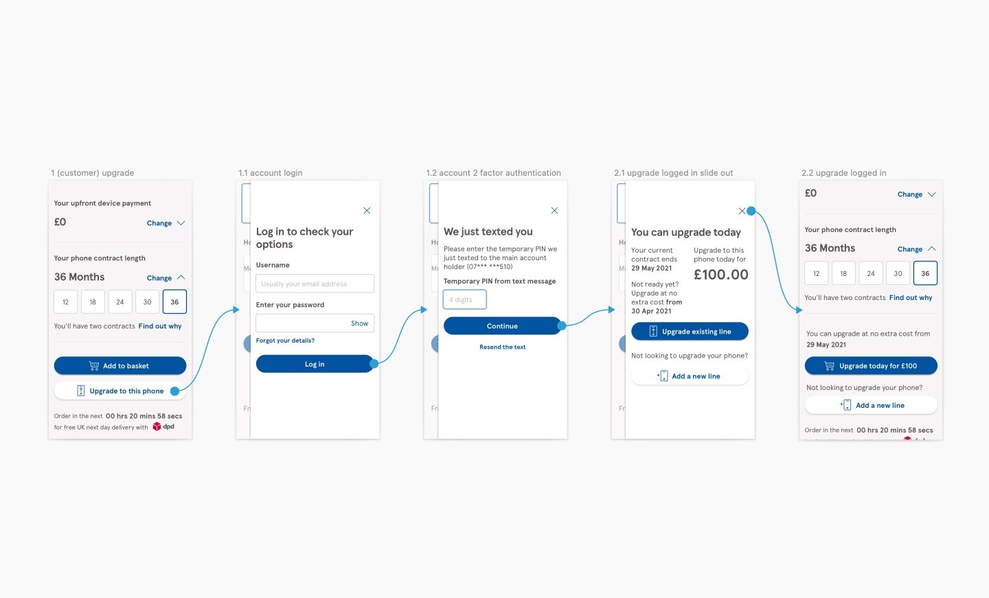 Once logged in, information such as when their contract would end and how much it would cost if they upgraded earlier would be shown on a separate screen and also where the main primary add to basket would have been on the product page.