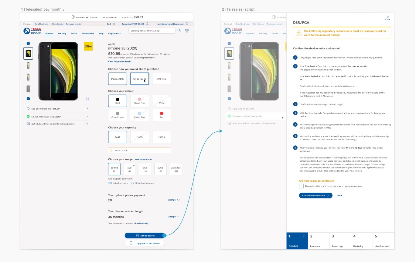 Telesales users can stay on the same page with a step by step process becoming available once adding the product to the basket.