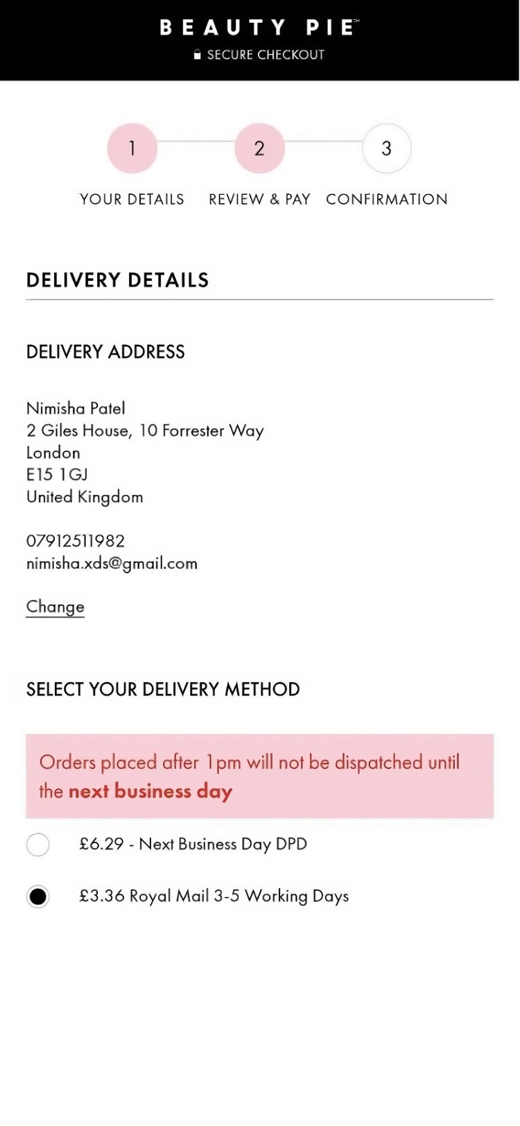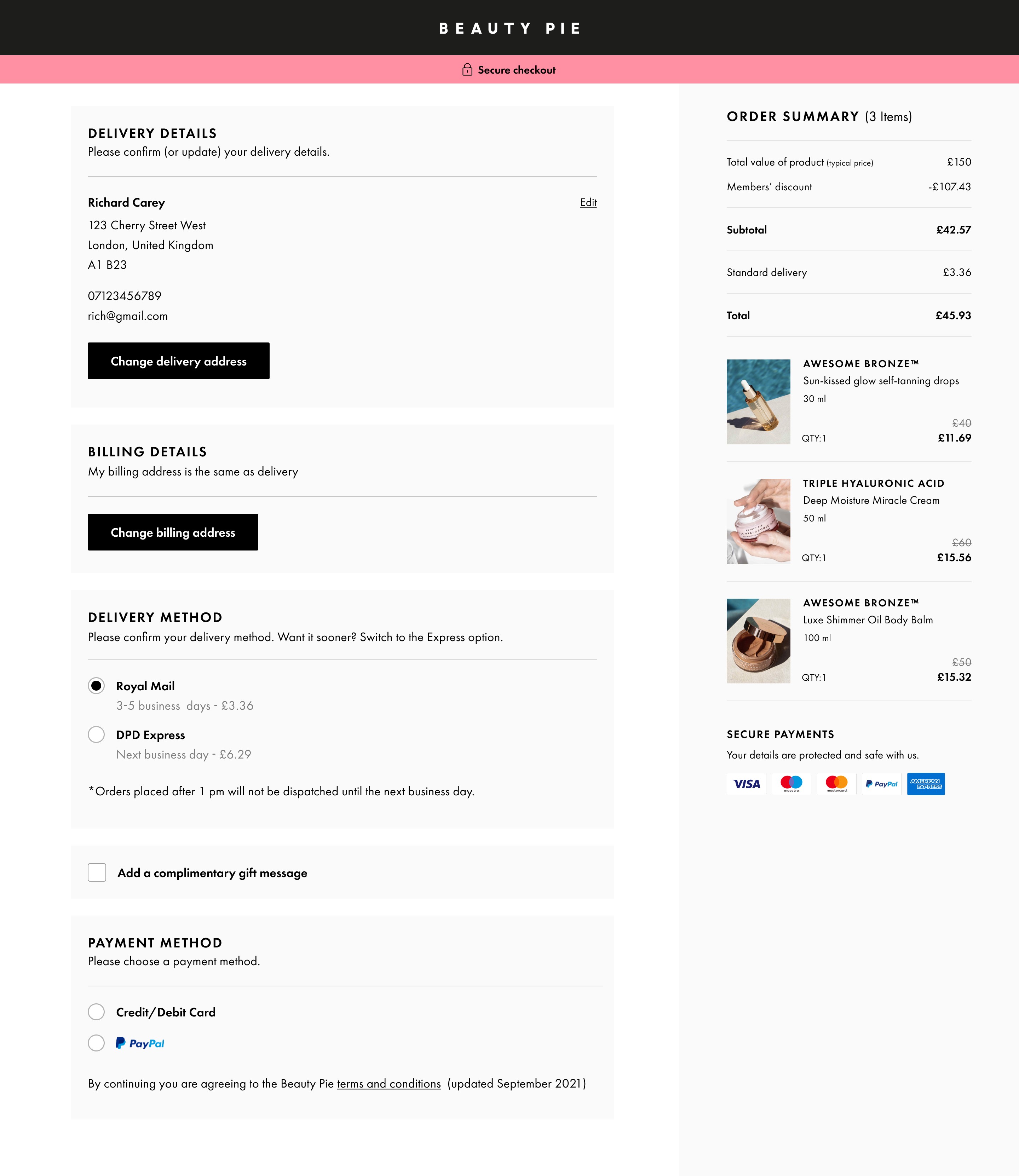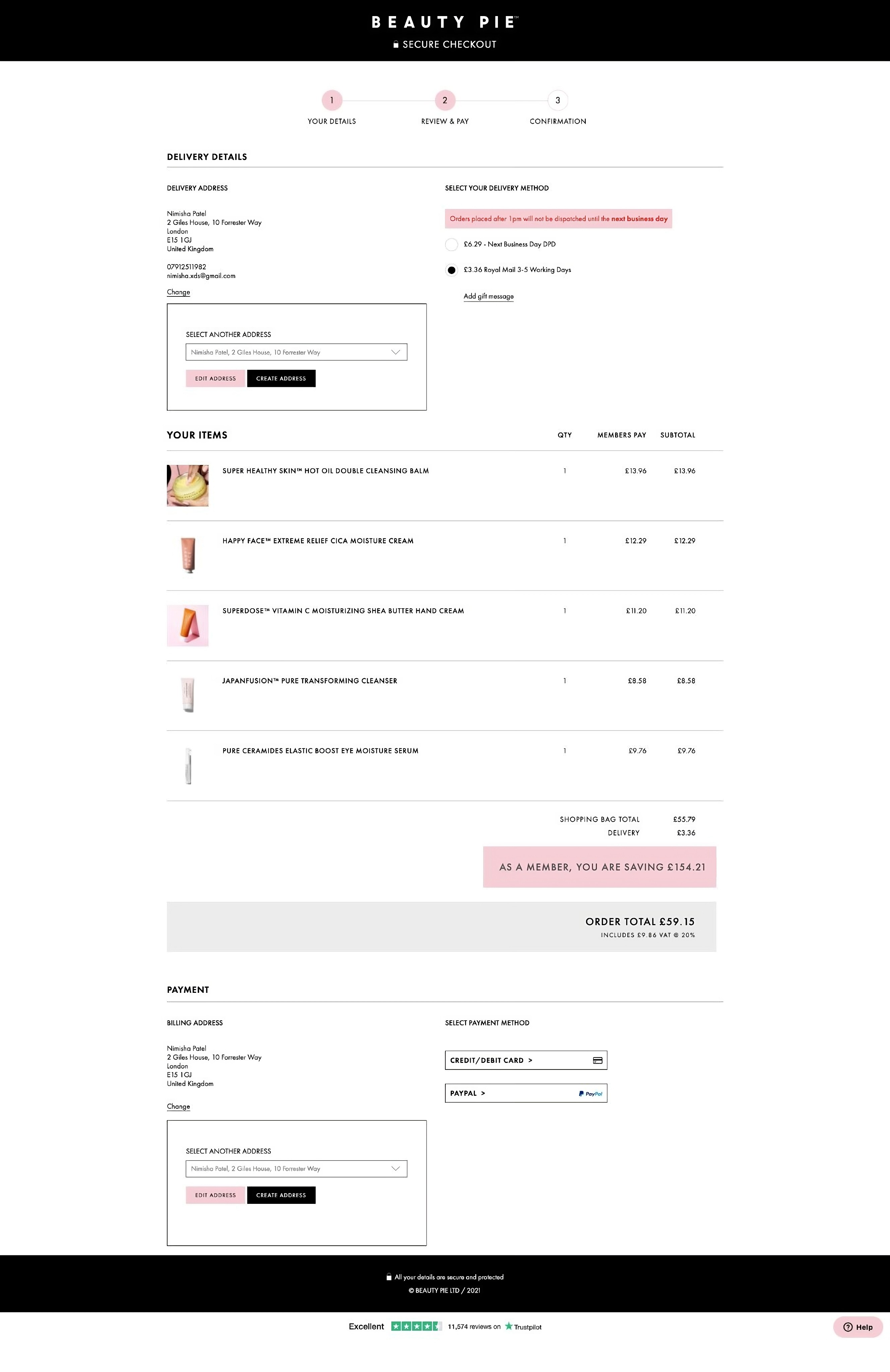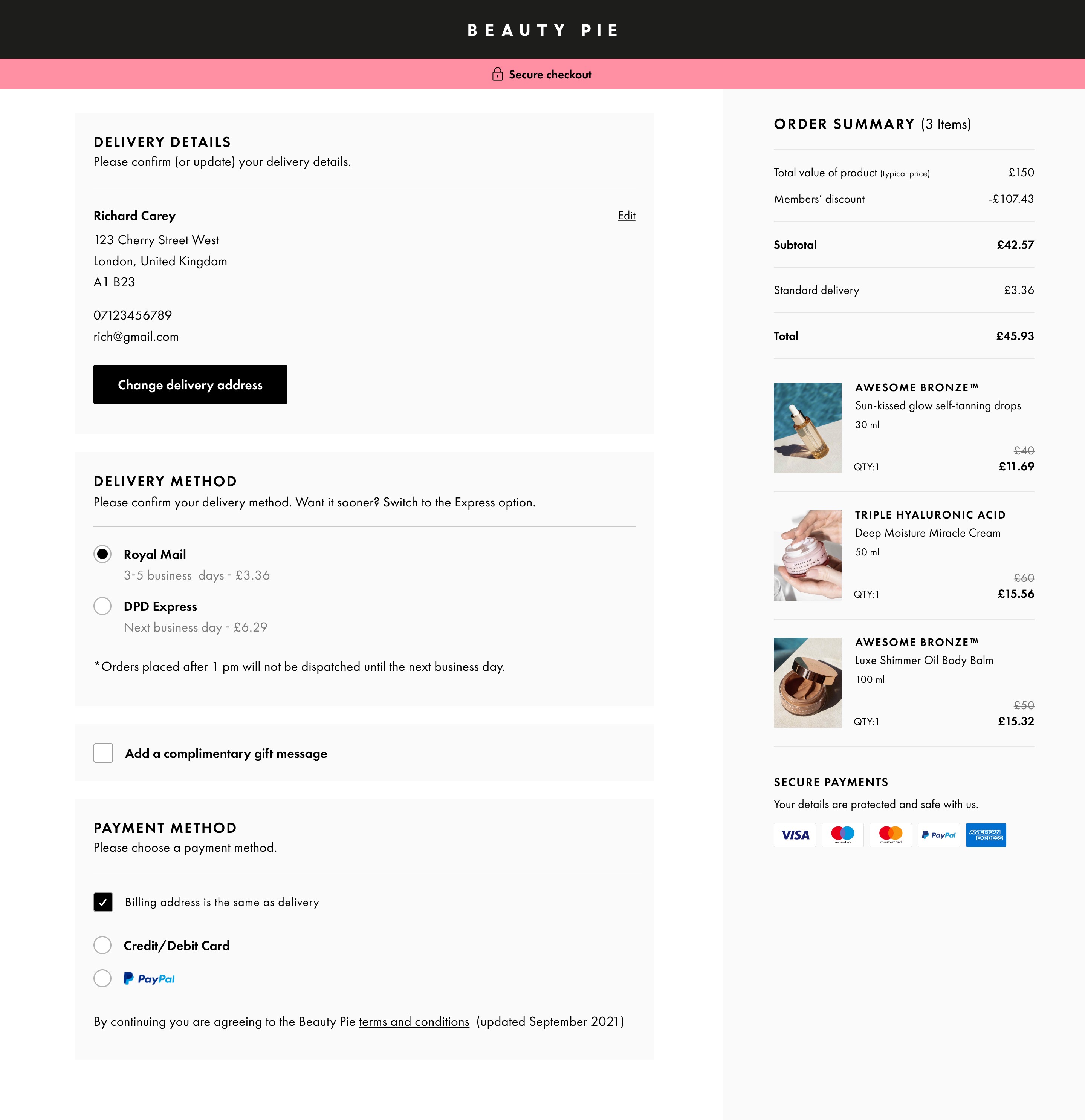 Consistent order summary: This reassures customers by keeping their order details in view without the user having to leave and disrupt the checkout flow and is a familiar and intuitive design pattern.